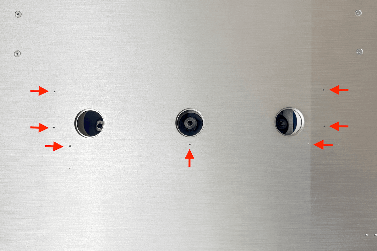 Bei der Bearbeitung der Deckelplatte wurden die sieben Bohrungen für den Absaugkanal versehentlich vollständig durchgebohrt und sind daher von der Oberseite sichtbar.