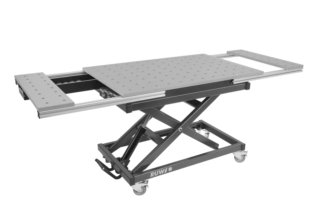 RUWI Classic løftebordet kombinerer maksimal fleksibilitet med praktisk organisering. Dens store perforerede panel (160 x 80 cm) kan forlænges op til 220 cm og tilbyder med en integreret skuffe masser af plads til tilbehør. Arbejdsemner kan også fastgøres lodret, da sporene i sideprofilerne er kompatible med Bessey GTR og lignende klemmer. Takket være dens robuste konstruktion og nemme højdejustering (53-113 cm) via fodpumpe bliver den hurtigt en uundværlig værkstedsløsning – udviklet af producenter, til producenter.