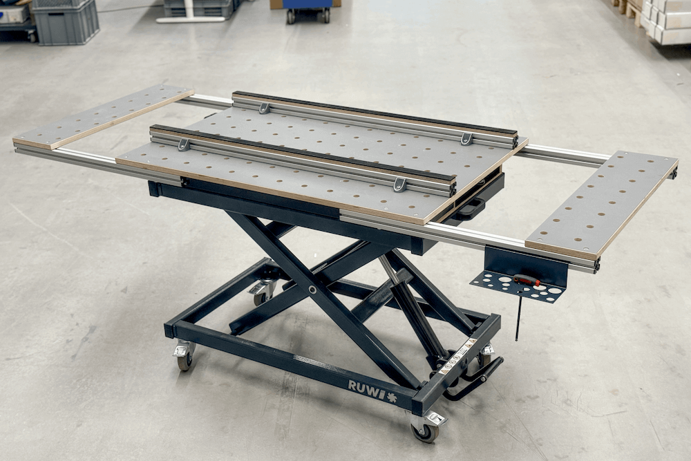 The RUWI Classic lift table combines maximum flexibility with practical organization. Its generous perforated grid plate (160 x 80 cm) can be extended up to 220 cm and offers plenty of space for accessories with an integrated drawer. Workpieces can also be fixed vertically, as the grooves in the side profiles are compatible with Bessey GTR and identical clamps. Thanks to its robust construction and simple height adjustment (53-113 cm) using a foot pump, it quickly becomes an indispensable workshop solution - developed by makers, for makers.