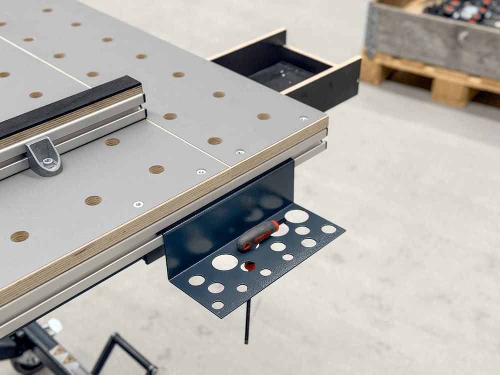 De RUWI Classic heftafel combineert maximale flexibiliteit met praktische organisatie. Het royale geperforeerde rooster (160 x 80 cm) kan worden uitgeschoven tot 220 cm en biedt veel ruimte voor accessoires met een geïntegreerde lade. Werkstukken kunnen ook verticaal worden vastgezet, omdat de groeven in de zijprofielen compatibel zijn met Bessey GTR en identieke klemmen. Dankzij de robuuste constructie en de eenvoudige hoogteverstelling (53-113 cm) met behulp van een voetpomp, wordt het al snel een onmisbare werkplaatsoplossing - ontwikkeld door makers, voor makers.