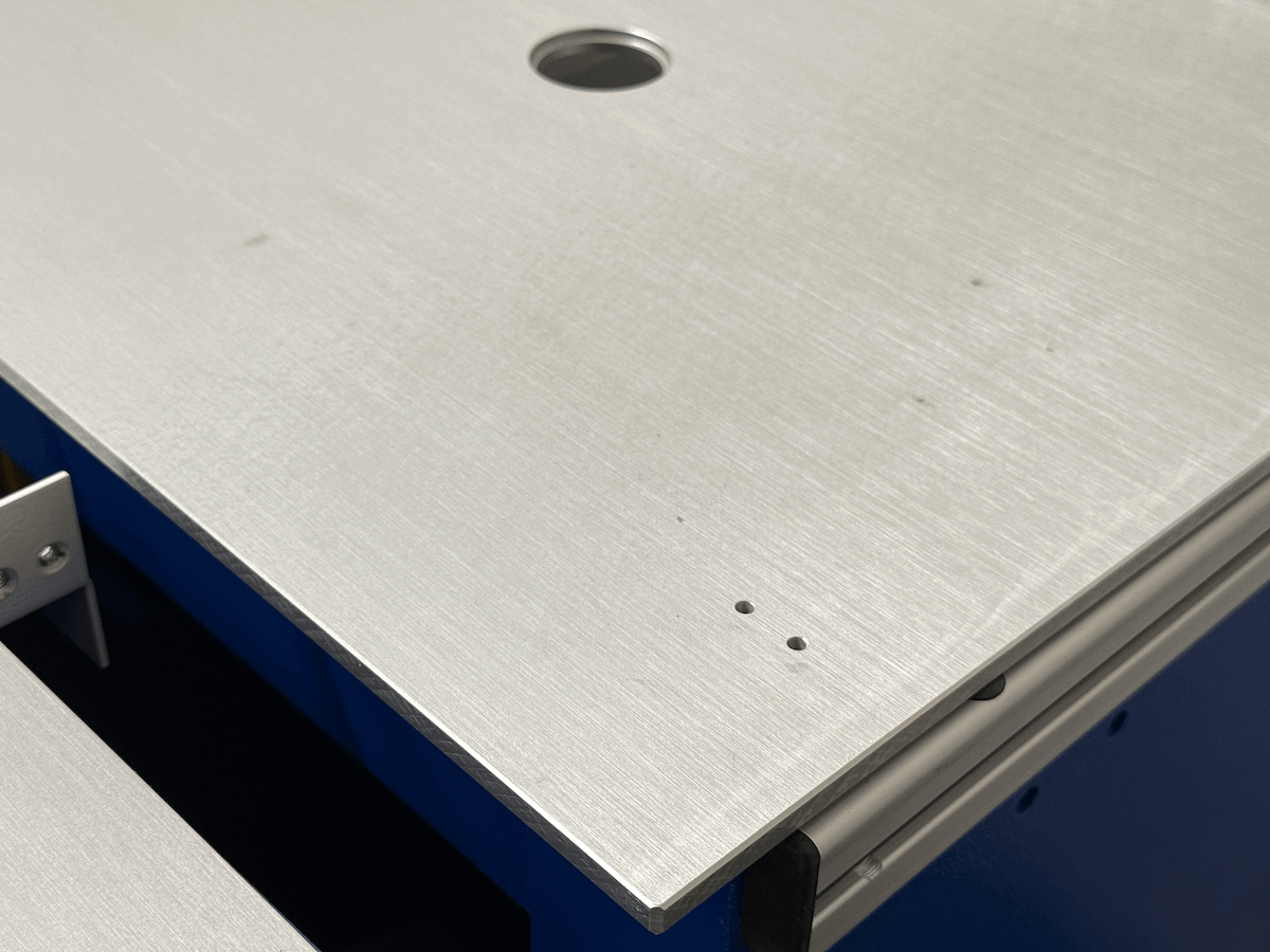 Im Zuge der Produktoptimierung wurden Versuche durchgeführt, weshalb die Deckelplatte 6 zusätzliche Bohrungen aufweist. Mit dem Frästisch kann jedoch ganz normal gearbeitet werden. Deshalb volle Funktionalität zum reduzierten Preis.